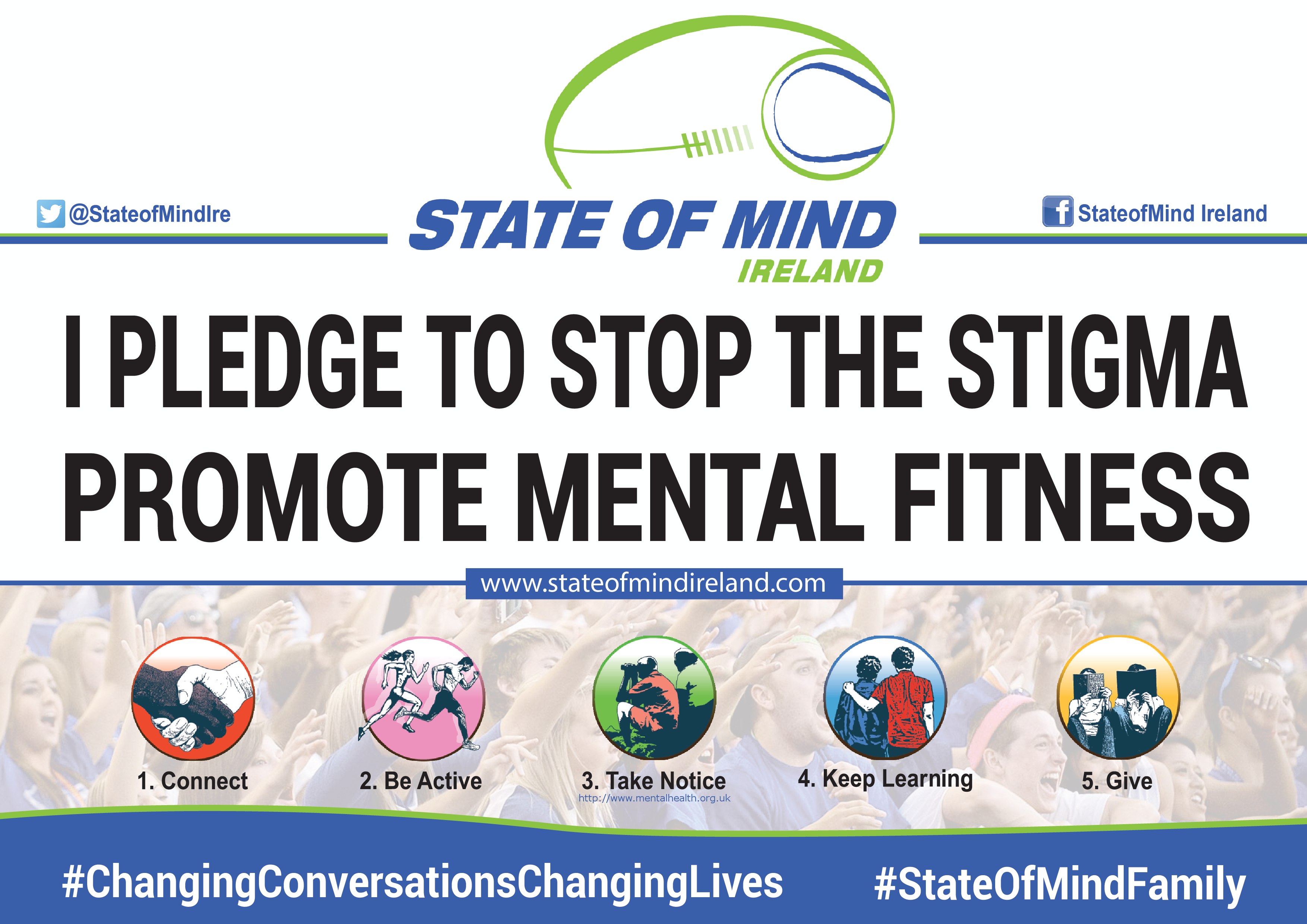Following the success of our presentation in September 2014, Dublin, we recently launched the State of Mind Ireland campaign at the CRSI 8th Annual Conference in June 2015, in UCC, Cork. The principle aim of our presentations is to highlight the significance of promoting issues surrounding mental health, wellbeing and the working life of sports players and sporting communities throughout the island of Ireland (North and South). State of Mind Ireland is also in the process of rolling out training in partnership with the HSE. We believe that early intervention will empower third level students by promoting mental fitness that is their level of resilience (ability to bounce back from adversity and wellbeing). The concept of the State of Mind Family is integral to the ethos of the entire project. Please take the pledge and change conversations. Together we can stop the stigma.